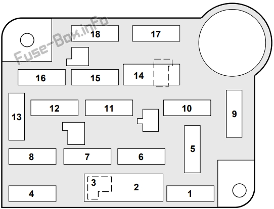 | 8 | Fusible (15) | Control electrónico automático de temperatura (EATC), elevalunas eléctrico, entrada sin llave, espejos eléctricos, foco de luz policial, memoria de reloj, módulo PATS, módulo de control de iluminación, SecuriLock. |