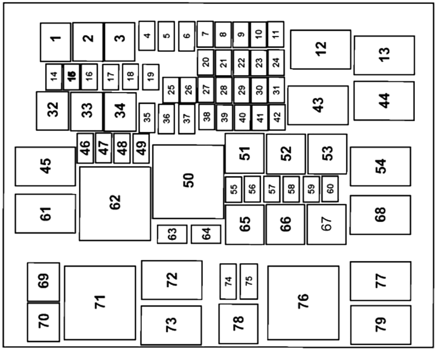 | 22 | Fusible (5) | Agua en el combustible, Bobina de control de relé del embrague del A/C, Bobina del relé de la bujía incandescente, Bobina de relé de control del ventilador: Encendido/Apagado, Bobina de relé de control del ventilador: Encendido/Apagado, Control variable de la bomba de aceite, Módulo del relé de AWD, Persiana de rejilla activa, Puente del solenoide del EGR, Vacío del freno AVC, Válvula variable del compresor del CA |